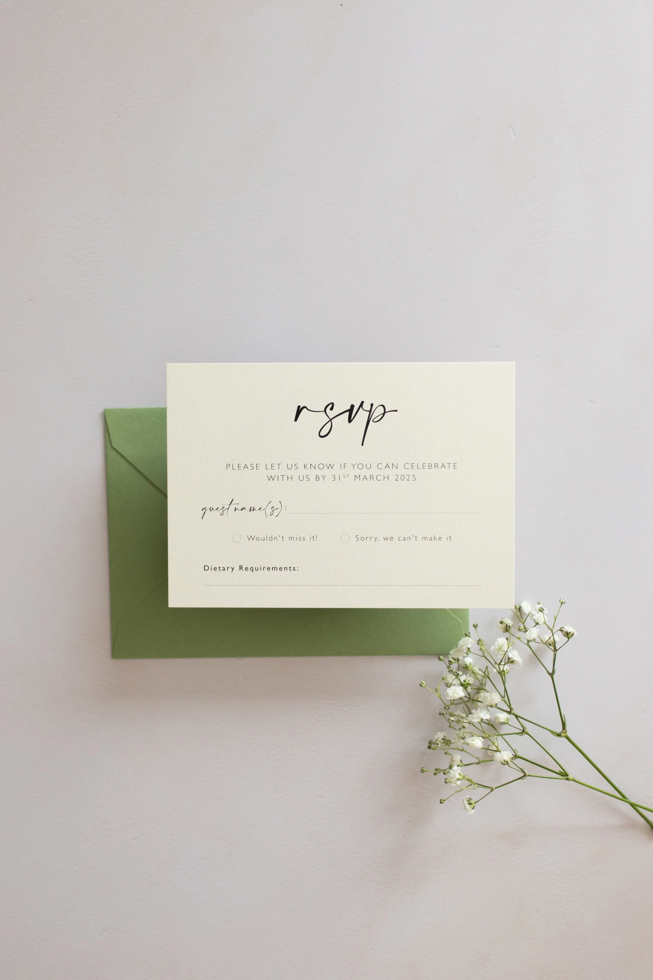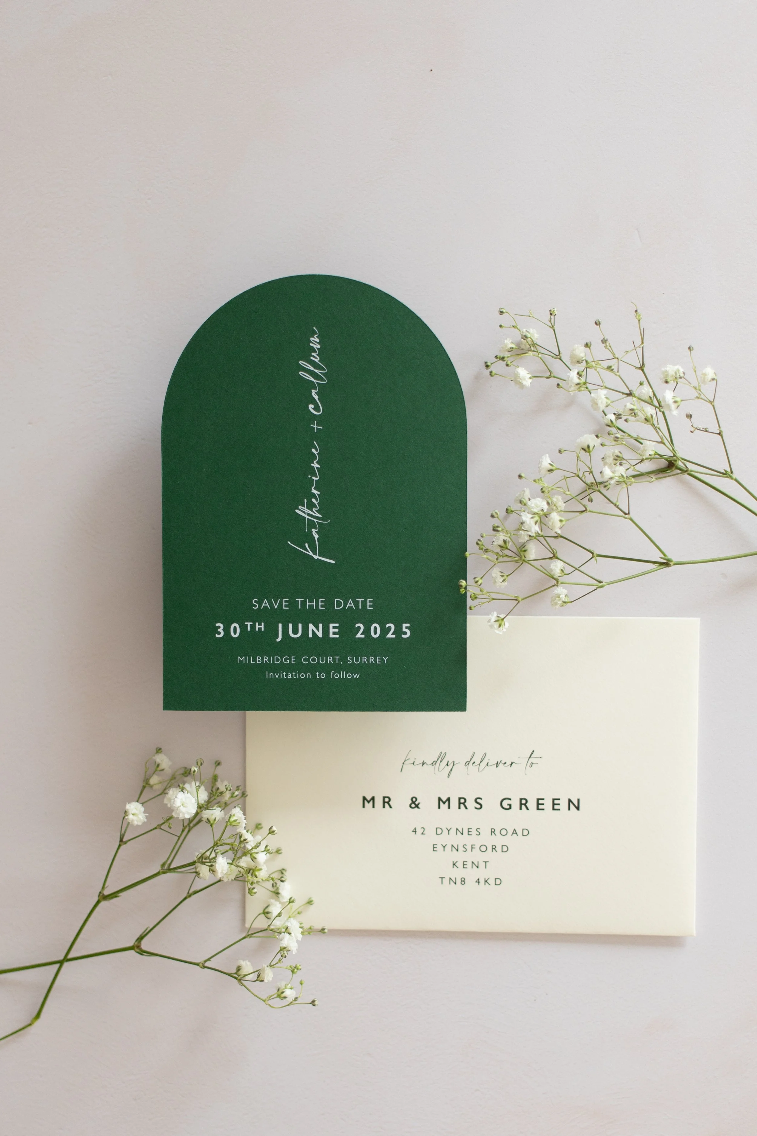Modern arch wedding invitation suite, with beautiful green tones inspired by the english countryside. Perfect for the couple getting married in the spring and summer, this palette is sure the compliment any wedding colour scheme. Ideal for those who wish to celebrate their enduring bond of friendship and set the tone for their big day.